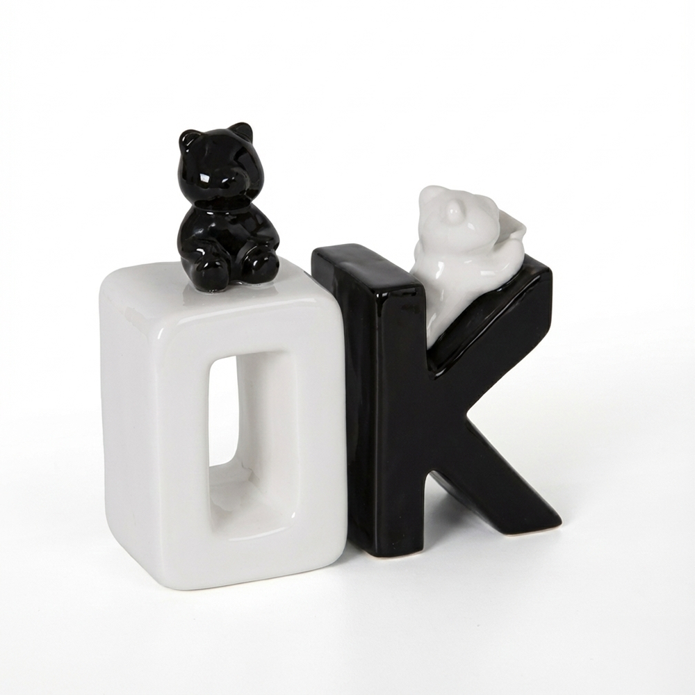 Desafía la monotonía con este adorno de cerámica que grita "Ok" en blanco y negro. Pieza audaz y minimalista que rompe esquemas, perfecta para quienes se atreven a expresar su actitud sin filtros. Su contraste geométrico transforma cualquier espacio en una declaración de confianza y rebeldía. Ideal para estantes, escritorios o cualquier rincón que necesite un toque de personalidad irreverente. Cerámica de calidad que combina arte contemporáneo con un mensaje directo: ¡tú decides tu propio camino!
