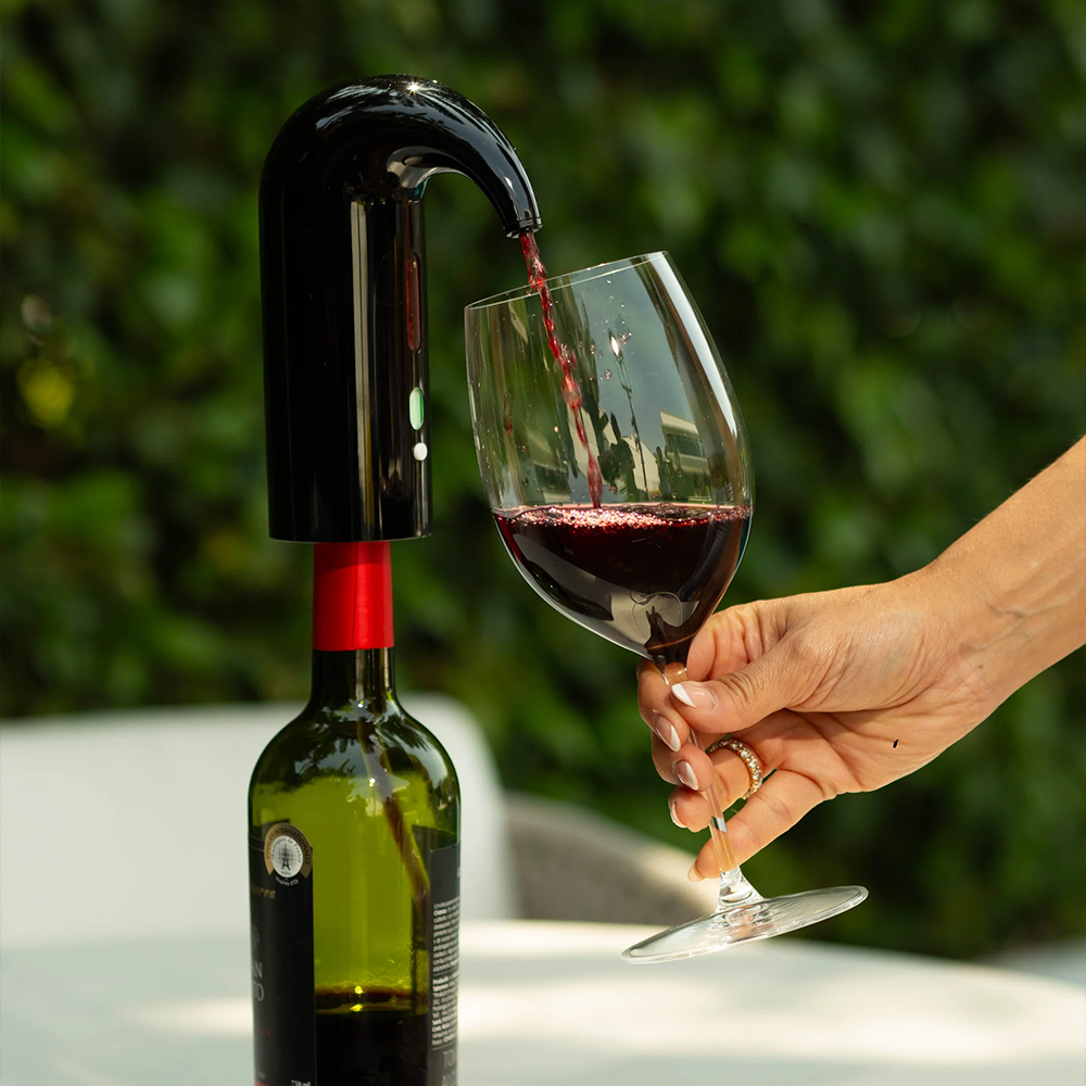 Dispositivo electrónico portátil diseñado para optimizar la aireación del vino de manera eficiente y controlada. Este decantador acelera el proceso de oxigenación, liberando aromas y sabores complejos que normalmente requieren horas de decantación tradicional. Ideal para enófilos que buscan disfrutar inmediatamente de las cualidades organolépticas óptimas de sus vinos.