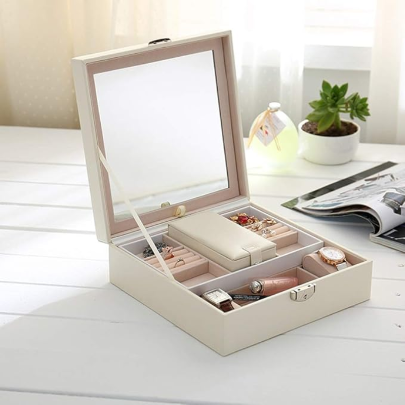 ¡Mantenga todas sus joyas organizadas en un solo lugar con nuestro joyero con espejo y cajón! El amplio espejo le permite lucir sus piezas favoritas, mientras que las divisiones y el cajón ofrecen un almacenamiento generoso. ¡Además, el diseño elegante y funcional añade un toque de estilo a su dormitorio!